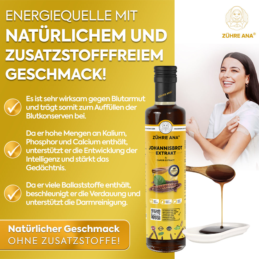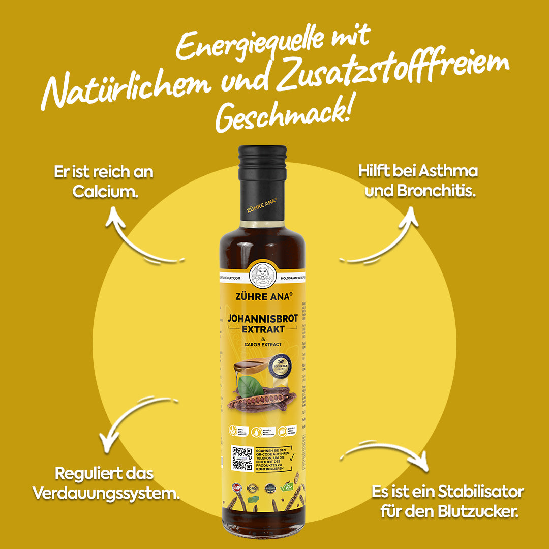 L'extrait de caroube, avec sa délicieuse saveur pure, constitue une source naturelle d'énergie. Ce sirop végétalien est riche en calcium, zinc, phosphore et potassium. Parfait pour les personnes ayant des besoins alimentaires particuliers. Notre sirop contient uniquement du sucre naturellement présent et est sans gluten ni glucose. Sa teneur élevée en vitamines renforce le système immunitaire et soutient le système respiratoire de manière naturelle. Un choix sain pour toute la famille.