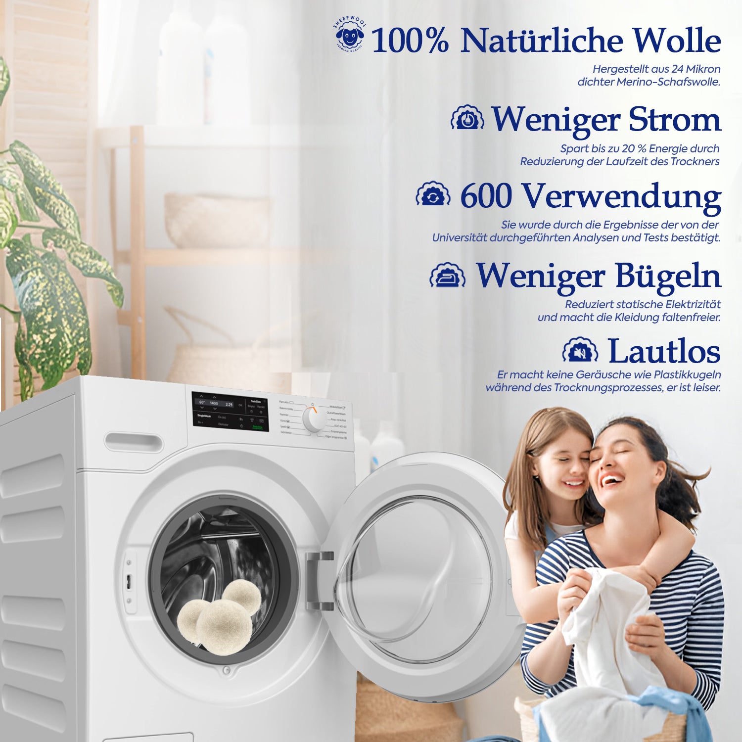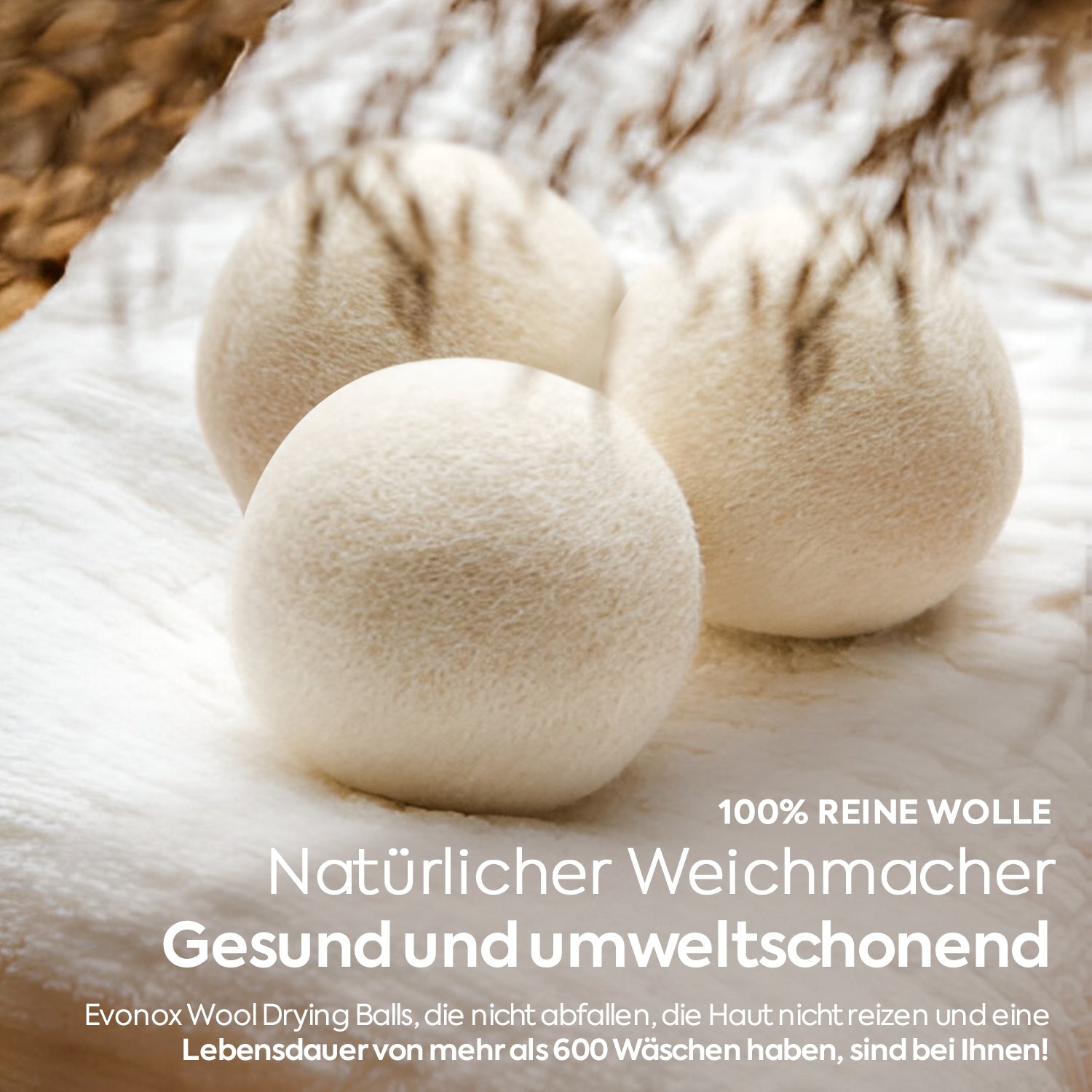 Evonox Wolltrocknungsbälle werden aus neuseeländischer Wolle Typ 0 und Merinowolle hergestellt. Sie enthalten keine schädlichen Chemikalien, sind ungiftig und sicher für Ihre Haut.