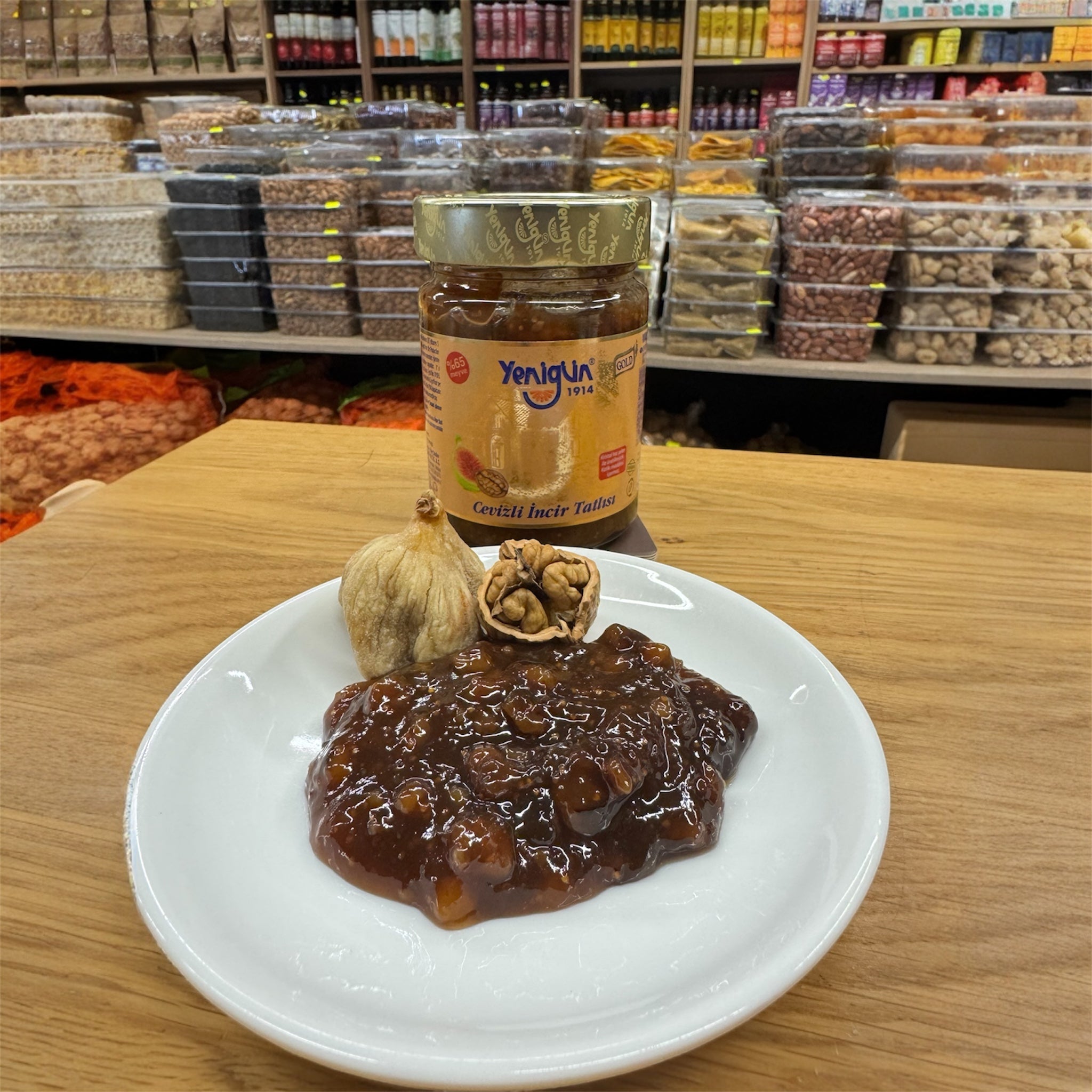 Die Yenigün Gold Serie Feigenmarmelade mit Walnüssen wird nach traditioneller Hausrezeptur hergestellt und enthält 65 % Fruchtanteil. Die Kombination aus süßen Feigen und knackigen Walnüssen sorgt für eine außergewöhnliche Textur und einen intensiven, natürlichen Geschmack – wie hausgemacht.