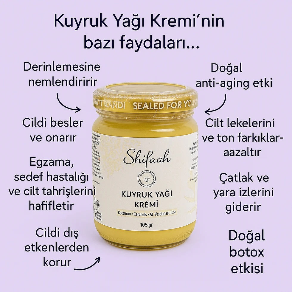 Kuyruk yağı kremi, cildinize derinlemesine nem sağlayarak kuruluk, çatlak ve hassasiyet gibi cilt problemlerine karşı doğal bir koruma sunar. Geleneksel bilgiyle modern formülün birleşimi sayesinde hem etkili hem de güvenlidir.